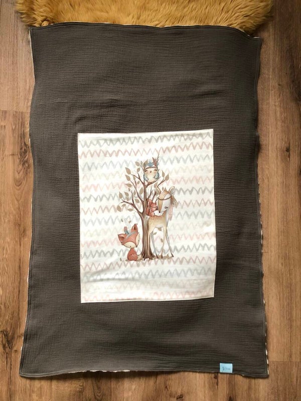 Aus weichem, schlamm farbenem Musselinestoff (Baumwolle) mit aufgenähtem Tier-Motiv und kuscheligem Plüschstoff mit Noppen in der Farbe taupe.